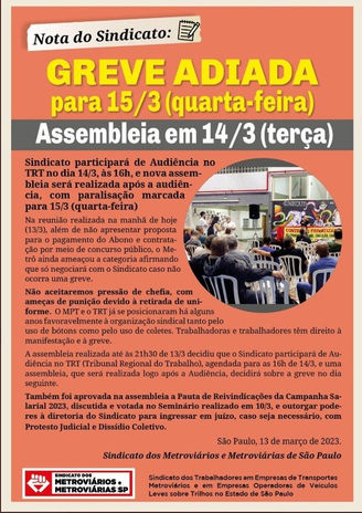 Em nota, o Sindicato dos Metroviários de São Paulo informou que o motivo da greve é a falta de novas contratações e propostas para pagamento de abono.