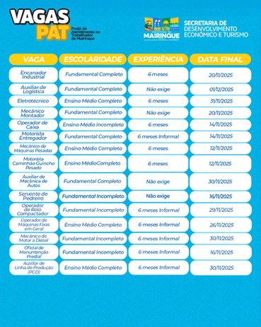 A Prefeitura de Mairinque, por meio da Secretaria de Desenvolvimento Econômico, anunciou nesta semana novas vagas disponíveis no Posto de Atendimento ao Trabalhador (PAT). São mais de 30 oportunidades em diversos segmentos, como indústria, comércio, serviços e construção civil, demonstrando o fortalecimento do mercado de trabalho local.